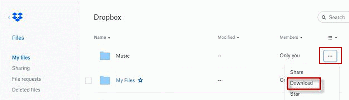 第2步:輸入dropbox.com並在您的計算機上登錄您的帳戶。您可以在 Dropbox 中找到音樂文件。點擊"…"圖示並將傳輸的音樂下載到您的計算機。
