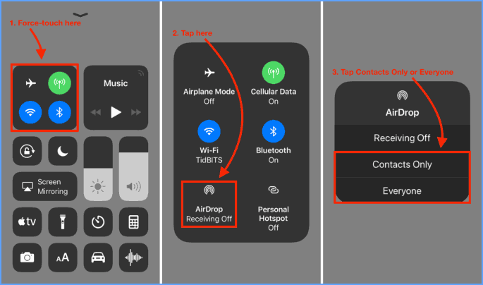 第1步:拉起iPhone屏幕,在控制中心找到AirDrop並將其打開。在 Mac 上,也可以從 Finder 打開 AirDrop。要連接 iPhone 和 Mac,請將 iPhone 和 Mac 設置為僅聯繫人或者每個人打開它們後。