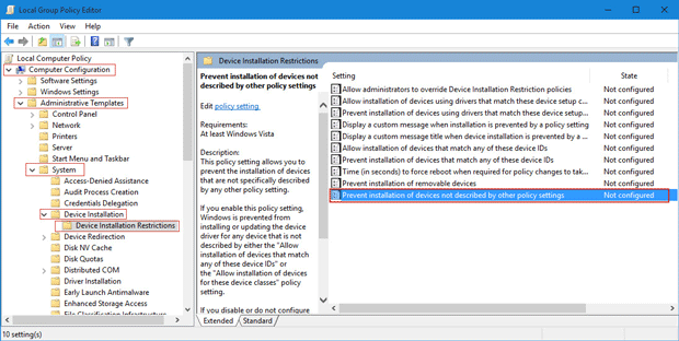 步驟2:導航到:計算機配置 - >管理模板 - >系統 - >設備安裝 - >設備安裝限制,然後雙擊項目“防止安裝其他策略設置未描述的設備”在右側窗格上。