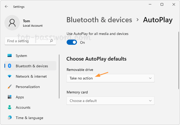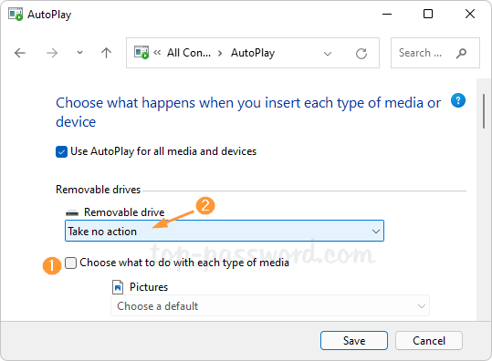- 在選擇自動播放默認值下,單擊下拉列表以選擇“不採取任何行動對於可移動驅動器。這將禁用 USB 驅動器的自動播放。