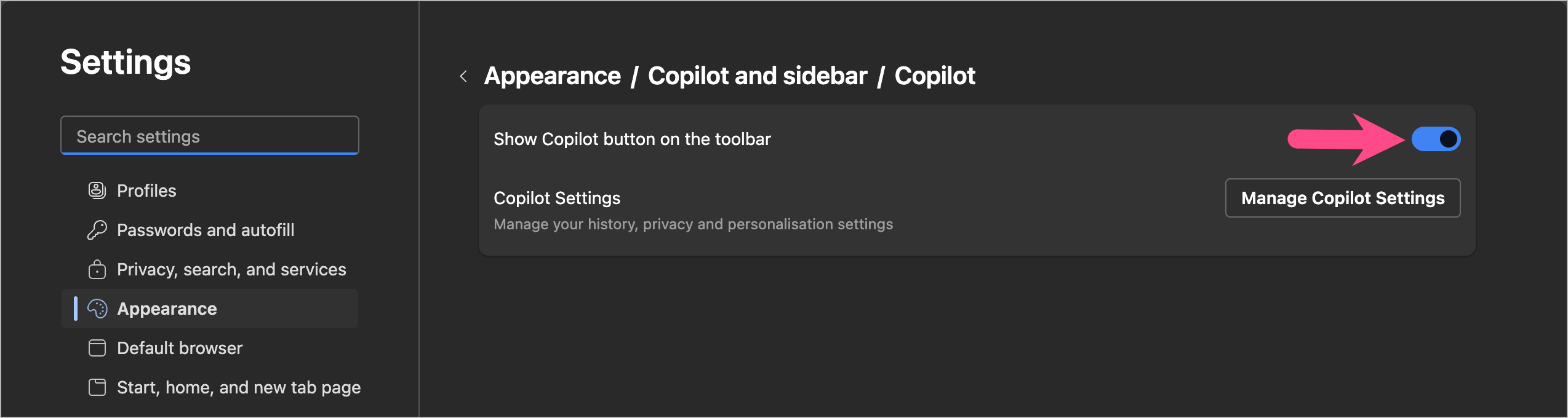 替代方式– 轉到邊緣設置 > 外觀 > 副駕駛和側邊欄 >副駕駛(在“應用程序特定設置”下)。關閉“在工具欄上顯示副駕駛按鈕”的開關。