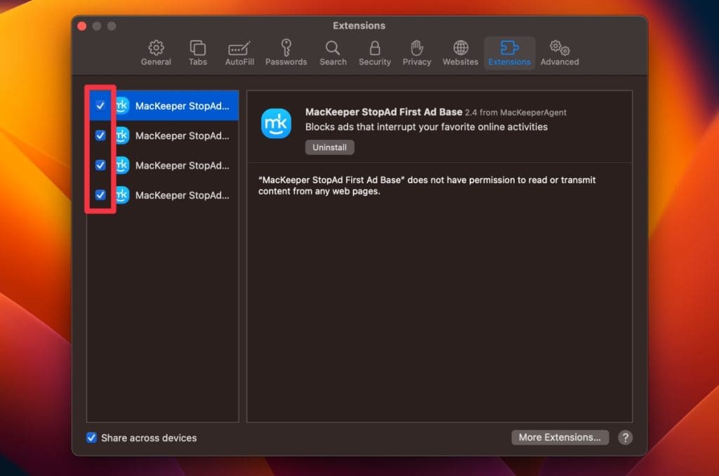 - 勾選旁邊的小方框MacKeeper StopAd 權限。