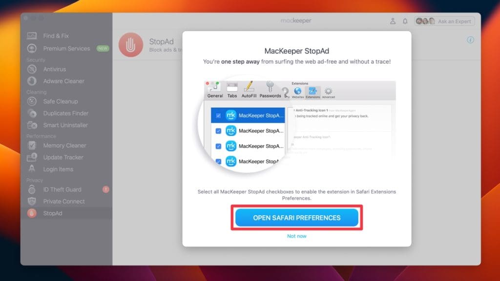 - 打開 MacKeeper 並單擊停止廣告在隱私部分。