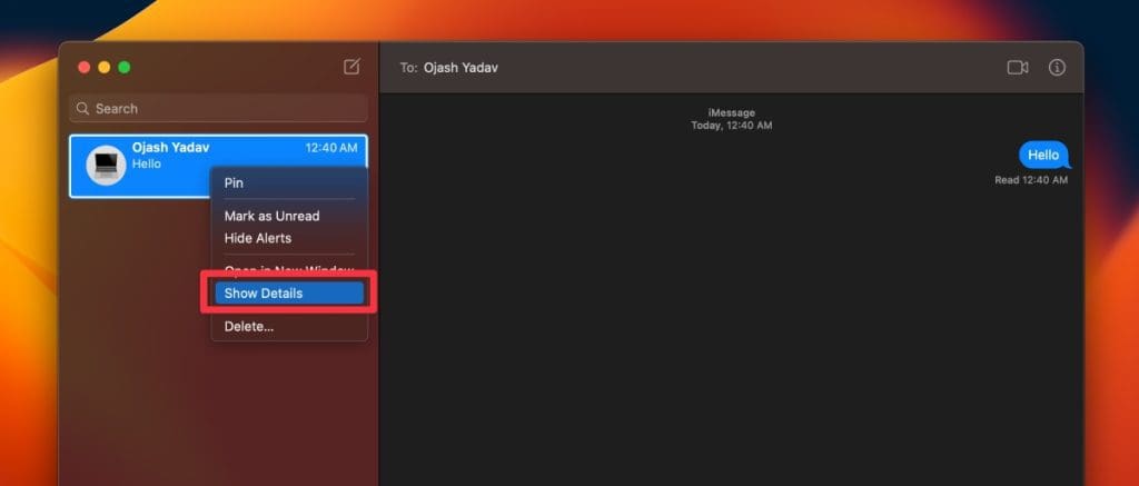 - 打開留言應用程序在 Mac 上,右鍵單擊要靜音的對話,然後選擇隱藏警報停止接收通知。