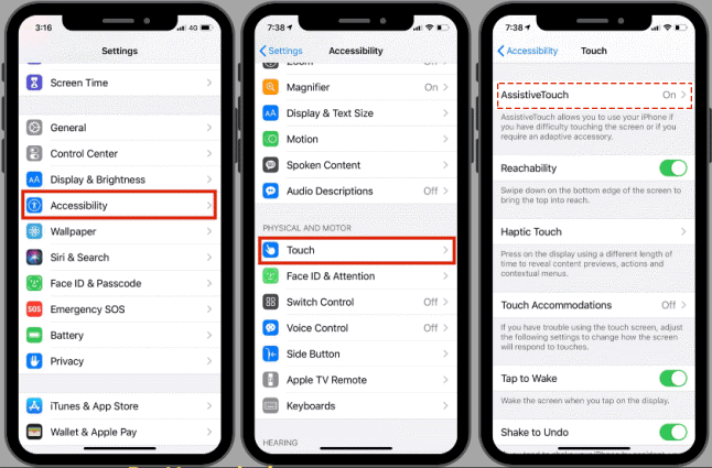 如果您設備的開/關按鈕停止工作,但其觸摸屏和菜單有響應,請嘗試此方法。您必須啟用輔助觸摸。如果未啟用輔助觸摸,請按照下面的步驟 1 操作,或者您可以參閱本指南了解如何在 iPhone 中啟用輔助觸摸。