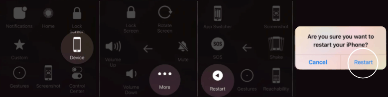 首先,前往“設置”>“輔助功能”>“觸摸”>“AssistiveTouch”,然後確保“AssistiveTouch”已啟用。現在,點擊屏幕上的輔助觸控出現的按鈕,然後點擊裝置>更多的>重新啟動。