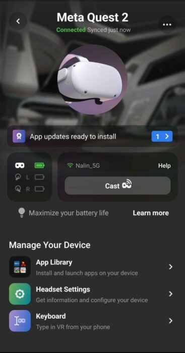 2. 在應用程序中,轉至菜單 > 設備並選擇您的 Quest 2。