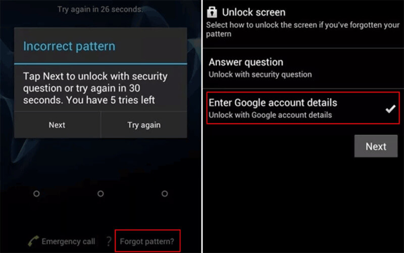 對於較舊的三星設備,此方法可靠並且可以保留您的數據。它的成功取決於擁有準確且最新的 Google 帳戶憑據。但是,對於 4.4 以上版本的三星設備,可能不會出現“忘記圖案”選項。在這種情況下,請參閱本指南中概述的其他選項,並選擇最適合您情況的選項。