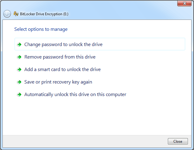 點擊管理 BitLocker鏈接,這將為您提供可用於刪除或更改 BitLocker 密碼的選項列表。