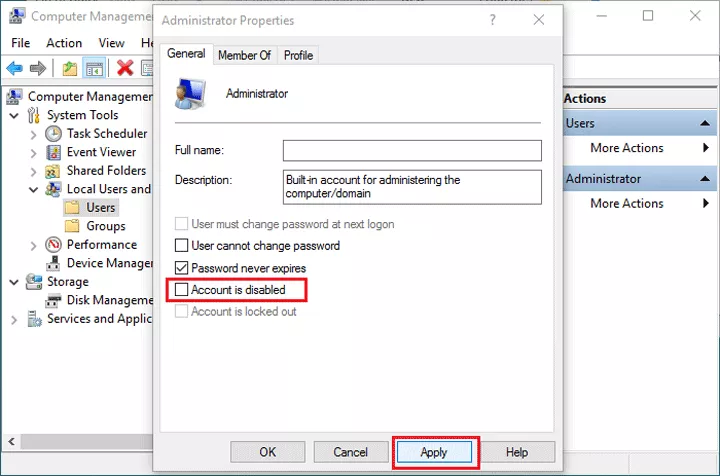步驟3取消選中帳戶已被禁用然後單擊申請保存更改。