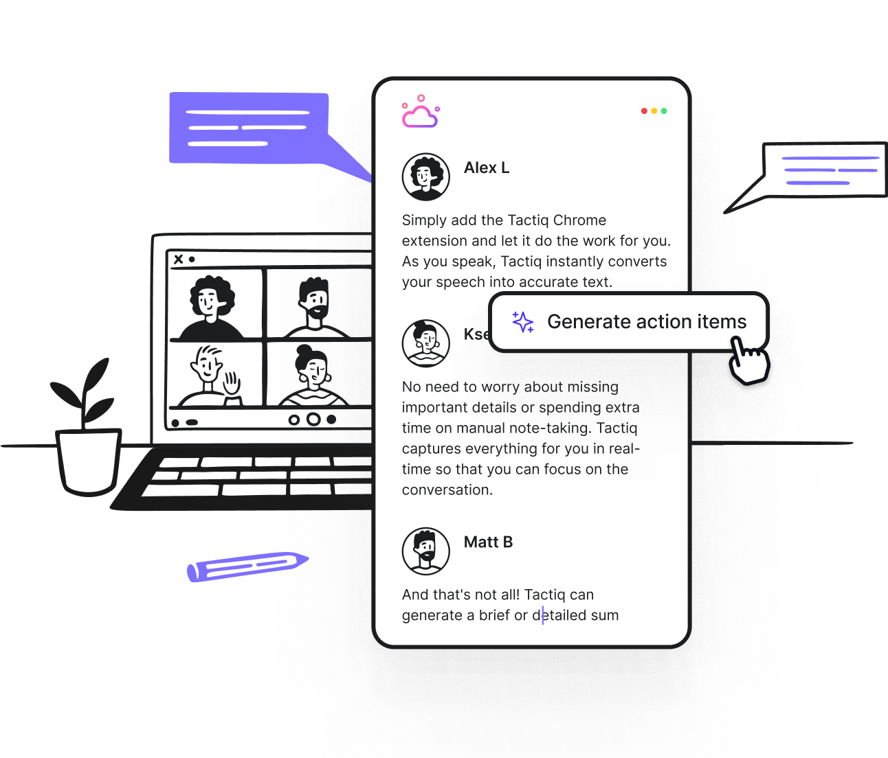 加入每月轉錄的 200 萬場會議,體驗 Tactiq 對您的工作效率帶來的改變。在此免費下載 Taactiq。