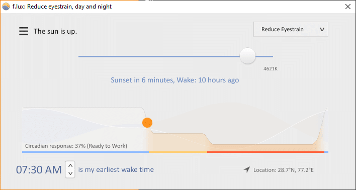 您可以下載此非常有用的應用程序稱為f.lux這樣可以使藍色光線過濾器用於運行較舊的Windows版本的PC。該應用程序帶有各種功能,包括預設,顏色過濾器,可根據您的需求自定義藍光過濾器。