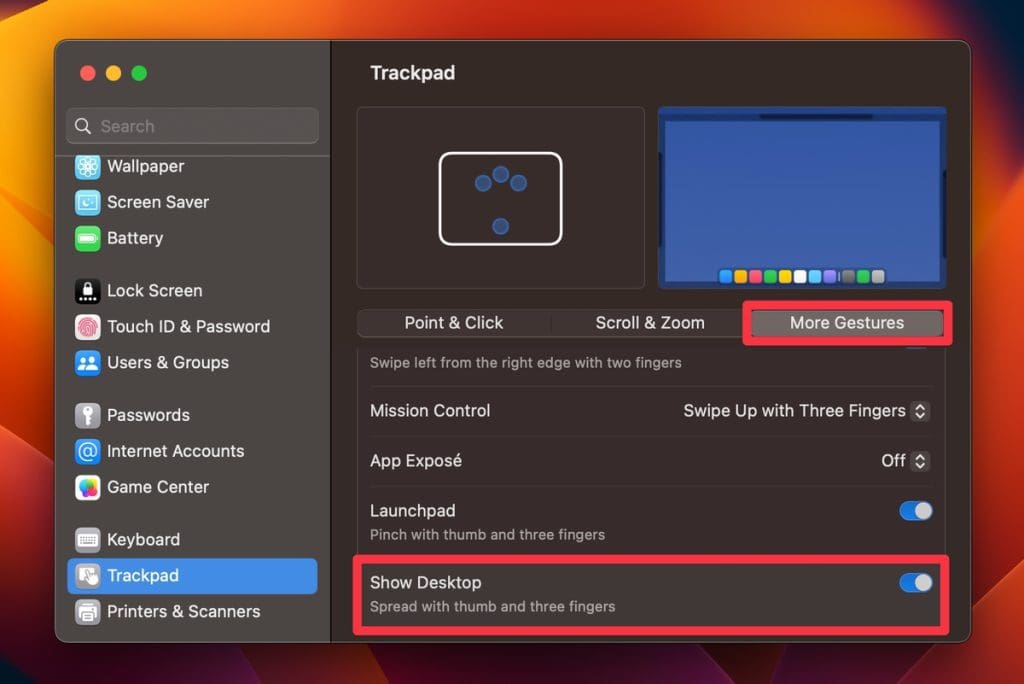 啟用後,使用表演桌面手勢(用拇指和三個手指散開)來最大程度地減少所有打開的窗戶並揭示桌面。