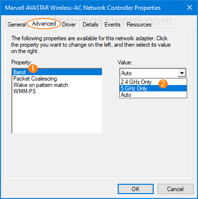 前往先進的選項卡。選擇“首選頻段“ 或者 ”樂隊”屬性,將其值更改為 2.4GHz 或 5GHz,然後單擊好的。就我而言,我想使用 5GHz 來獲得更快的 WiFi 體驗。