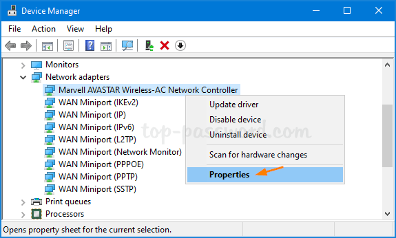 擴張網絡適配器並右鍵單擊您的 WiFi 適配器,然後選擇特性。