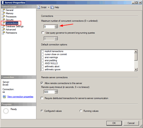 要配置最大用戶連接數,請打開 SQL Server Management Studio 並連接到數據庫,然後執行以下步驟: