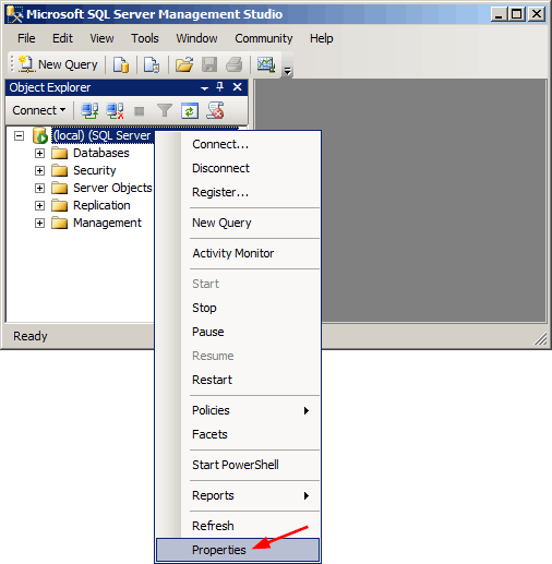 - 在對象資源管理器中,右鍵單擊服務器,然後單擊特性。