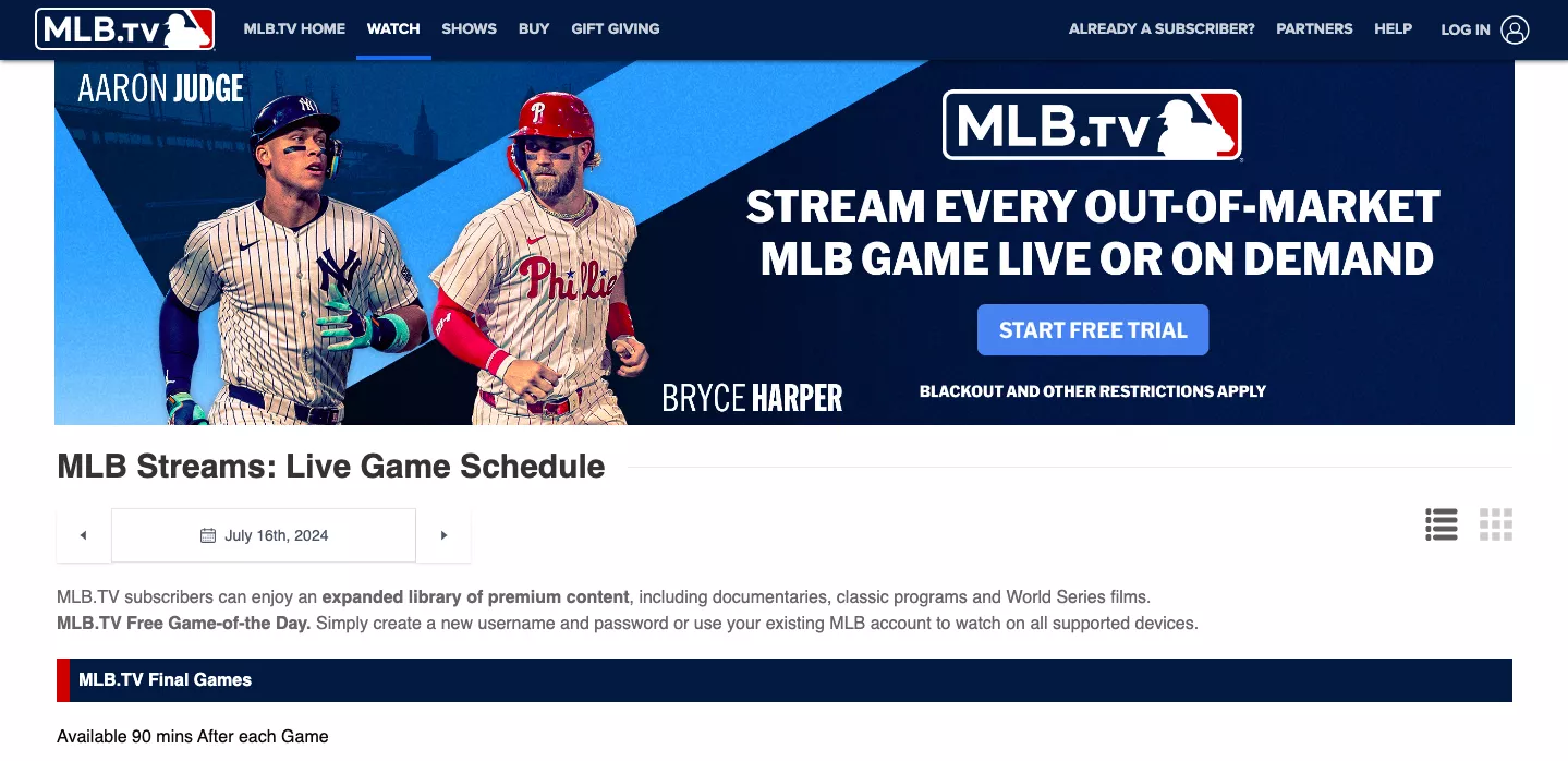 通過以下方式訪問精選的 Orioles 遊戲訂閱。這項流行的流媒體服務提供付費 MLB 電視附加服務,在基本套餐的基礎上每月還需支付 25 美元。該平台還提供 30 天免費試用和海量點播內容庫。