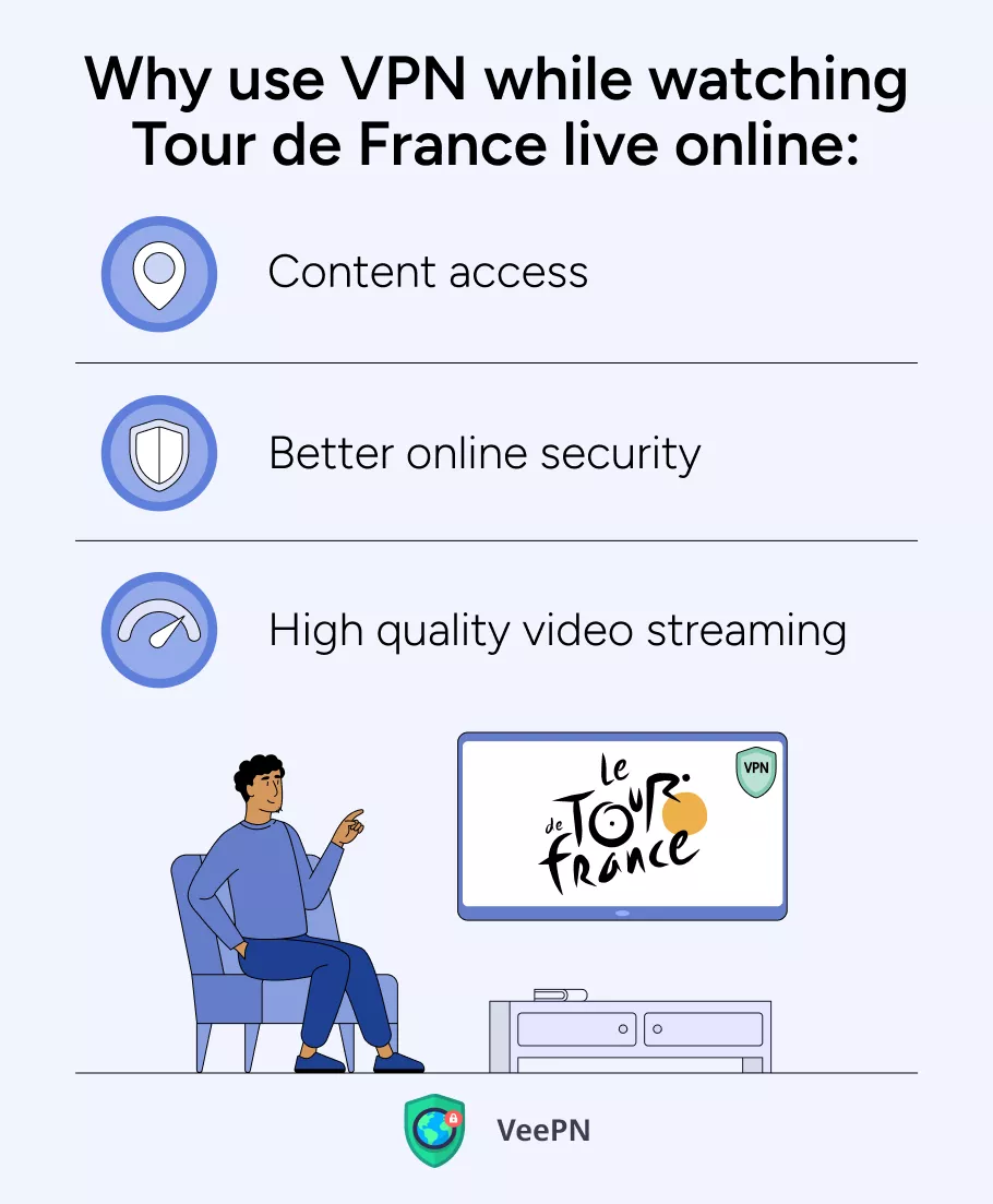 - 內容訪問出國旅行時。通過使用 VPN 應用程序,您可以連接到遠程服務器,這樣您就可以像在家中一樣訪問和欣賞環法自行車賽的直播。