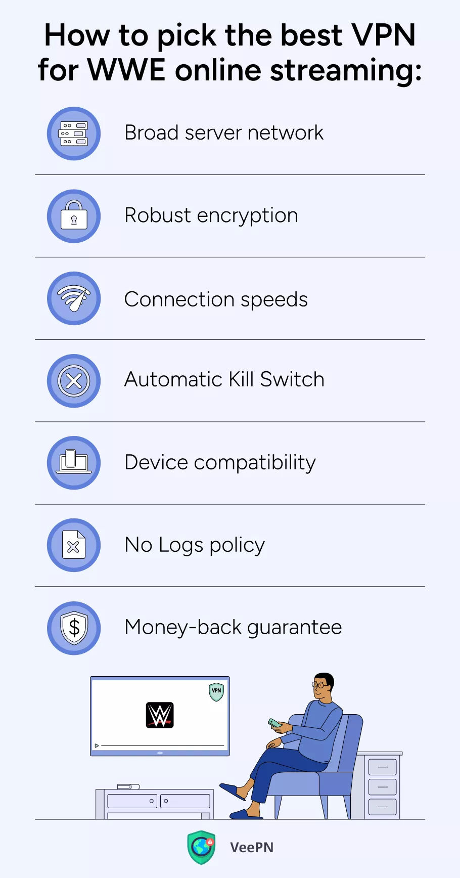 但是,我們想警告您不要使用免費 VPN 應用程序。儘管它們看起來很誘人,但它們通常缺乏良好的連接質量,並且可能會收集您的個人信息並將其出售給廣告公司。為此,我們來討論如何選擇一個可靠的優質 VPN,它可以顯著改善您在線觀看 WWE 摔跤的體驗。
