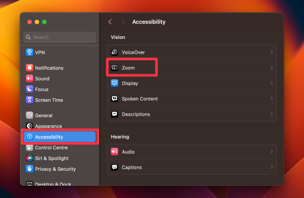 是的,您可以自定義Mac上的縮放級別。去系統設置在您的Mac上。點擊可訪問性>選擇飛漲。檢查旁邊的框使用鍵盤快捷鍵進行縮放。通過在下方移動滑塊來調整縮放水平縮放樣式。您還可以啟用其他選項光滑的圖像或者關注重點。