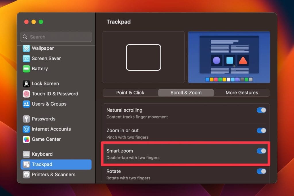 但是,您必須首先啟用觸控板手勢來縮小Mac屏幕。以下是: