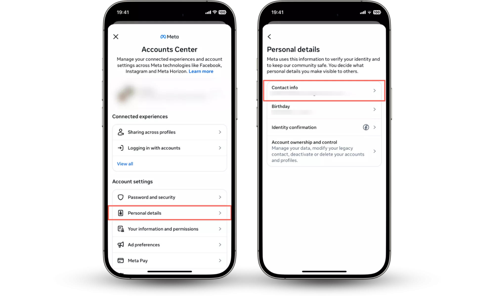 步驟 1-3:轉到帳戶中心並點擊個人詳細信息 > 聯繫信息以檢查電子郵件帳戶更改。