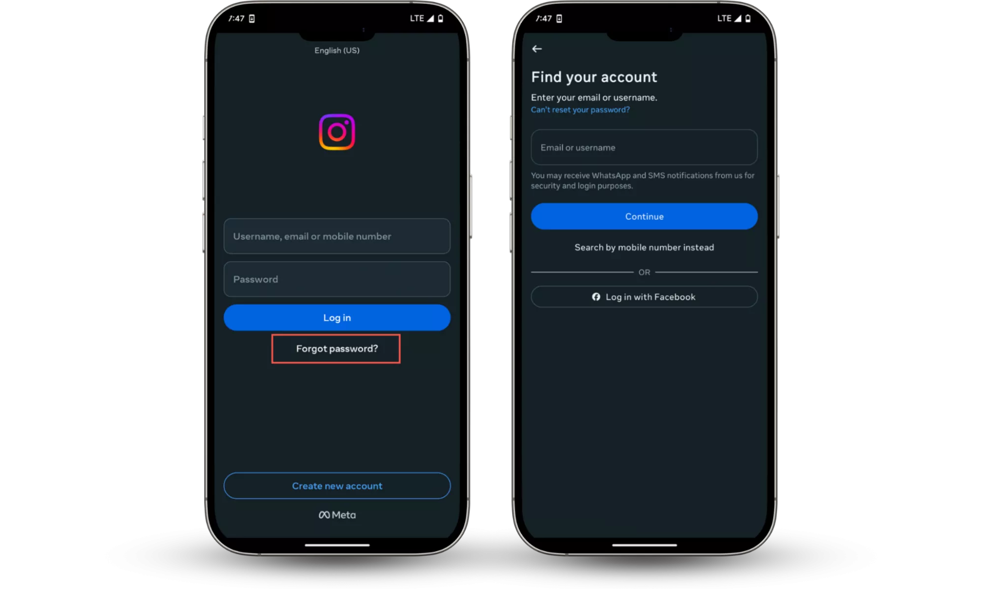 - 輸入您的 Instagram 用戶名、電話號碼或電子郵件,然後按照屏幕上的說明恢復您的帳戶。