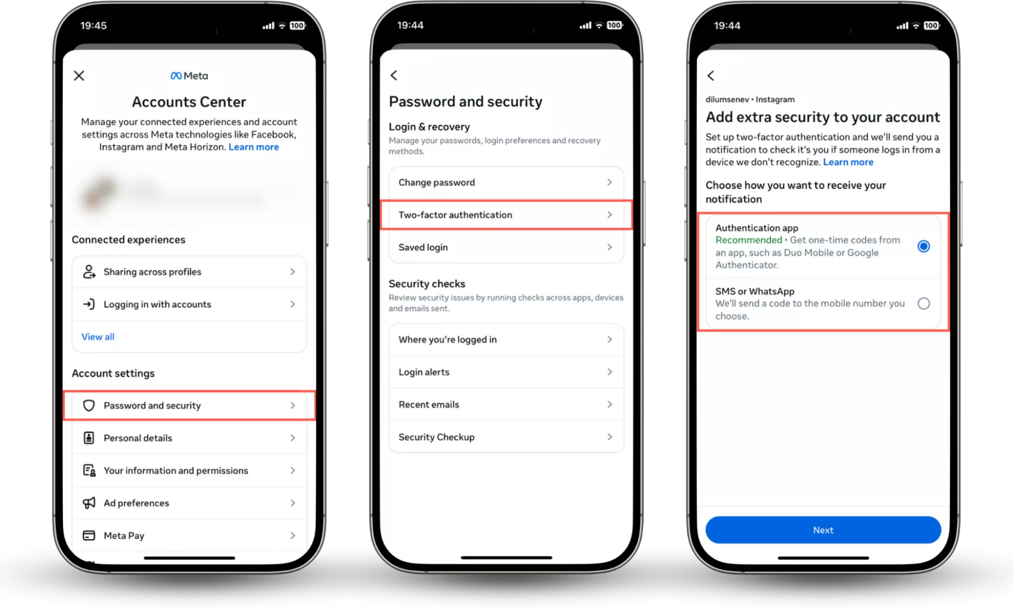 步驟 1-3:轉到帳戶中心並點擊密碼和安全 > 雙因素身份驗證以添加額外的安全性。