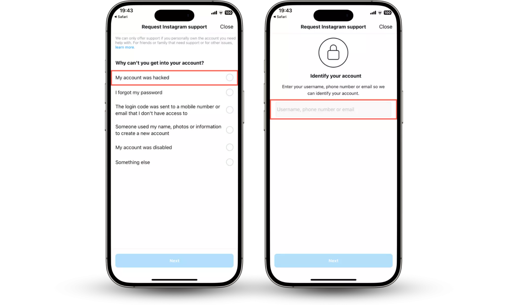 步驟 1-3:報告被黑的 Instagram 帳戶並驗證您的身份以恢復該帳戶。