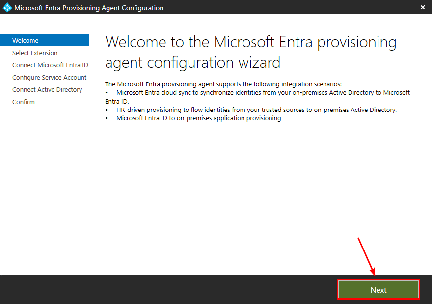 - 點擊下一個在“歡迎使用 Microsoft Entra 配置代理配置嚮導”屏幕中