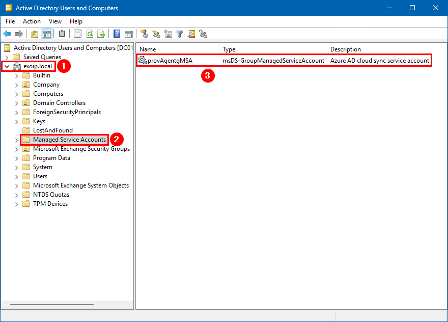 - 導航至域 (exoip.local) > 託管服務帳戶