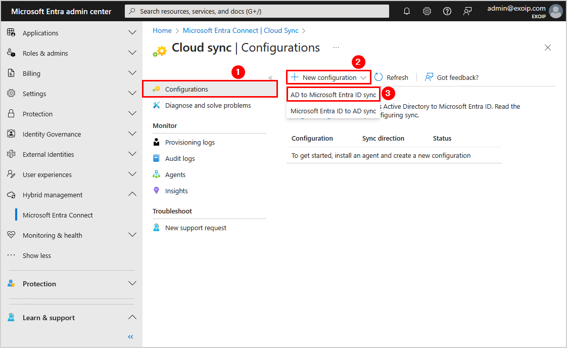 - 選擇+ 新配置 > AD 到 Microsoft Entra ID 同步