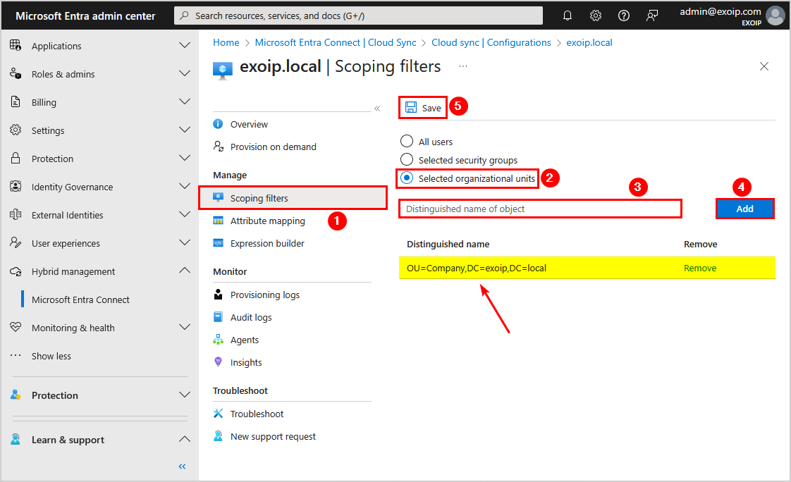 - 填寫專有名稱的本地組織單位您想要與 Microsoft Entra ID 同步的
