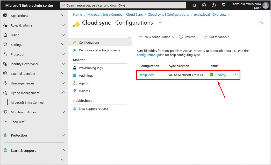 - 驗證從 AD 到 Microsoft Entra ID 的配置同步顯示狀態健康