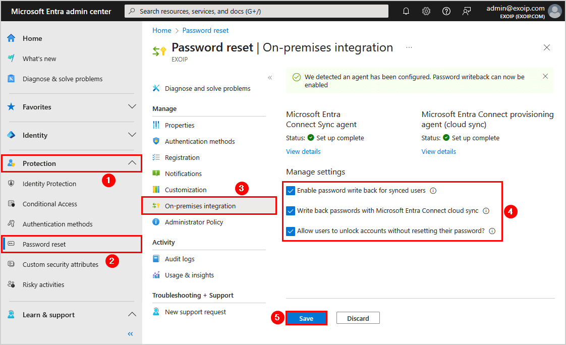 按照以下步驟允許 Microsoft Entra ID 中的密碼更改同步回本地 AD:
