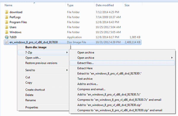 - 現在我們需要將安裝文件從 Windows 8 ISO 複製到您的硬盤上。這可以使用免費軟件來完成7-拉鍊。本地安裝 7-Zip 後,右鍵單擊您的 Windows 8 ISO 映像並選擇7-拉鍊->提取文件。