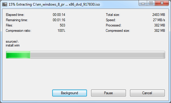 完成此操作後,提取對話框將自動關閉。現在您已成功將 Windows 8 ISO 的所有內容複製到硬盤上。