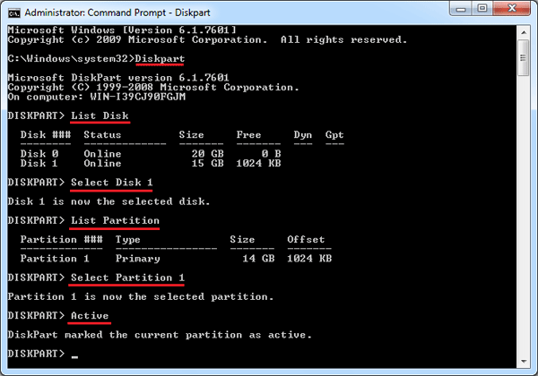 上面的命令會將連接的硬盤驅動器的第一個分區設置為活動分區。