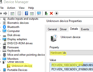 按Shift+F10在設置屏幕上並運行devmgmt.msc命令。打開未知設備的屬性,轉到細節選項卡,選擇硬件 ID屬性,並複制 ID。