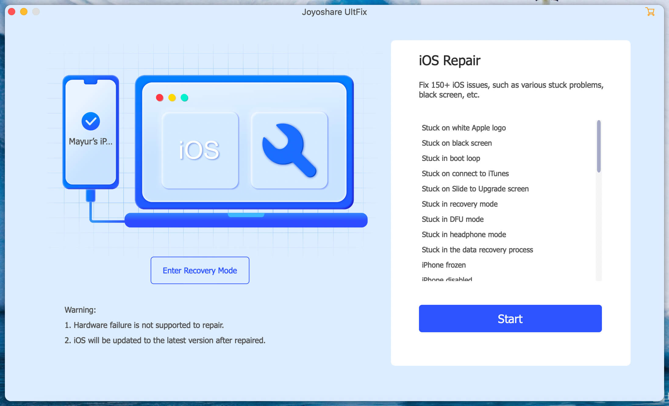或者,您可以求助於 iOS 系統恢復程序,例如Joyoshare UltFix修復 iOS 設備上的任何故障、崩潰和潛在的軟件問題。該工具可以修復與啟動循環、黑屏和旋轉輪、屏幕閃爍、iPhone無法連接iTunes等相關的問題。此外,它還可以幫助您根據需要降級和升級iOS版本。