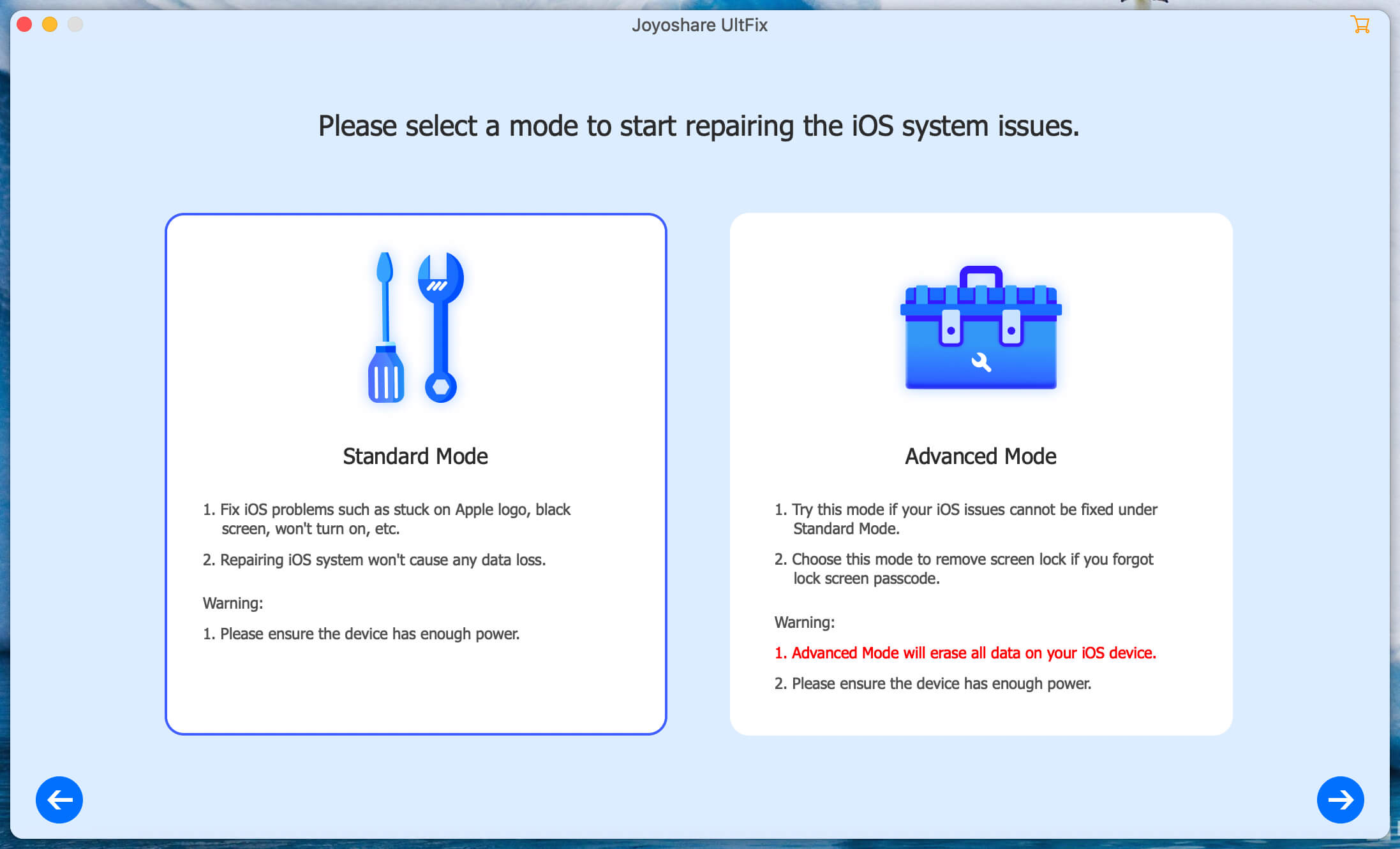 - 選擇 ”標準模式”,將 iPhone 啟動至恢復或 DFU 模式,然後單擊“下一步”。