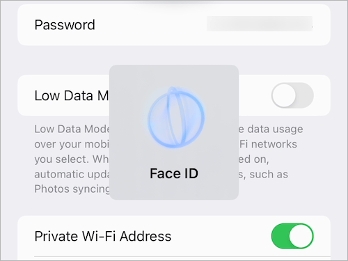 - 使用 Face ID、Touch ID 或設備密碼成功進行身份驗證後,您將看到已保存的 Wi-Fi 網絡列表。