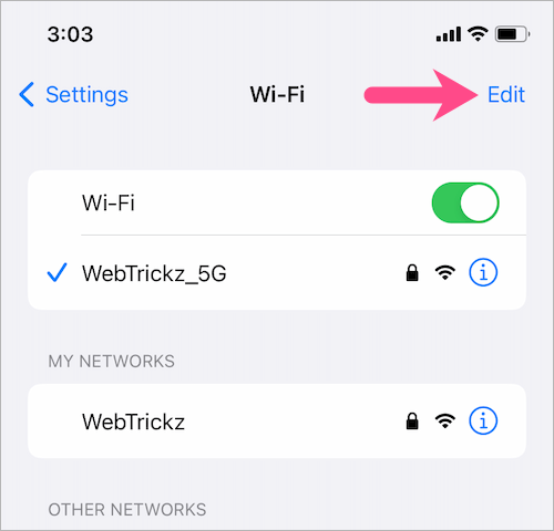 - 在 Wi-Fi 屏幕上,點擊 '編輯' 按鈕位於右上角。