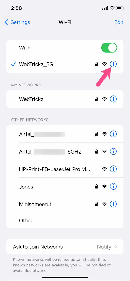 - 在 Wi-Fi 設置屏幕上,點擊信息按鈕(i 圖標)位於您的 iPhone 或 iPad 連接到的特定網絡旁邊。