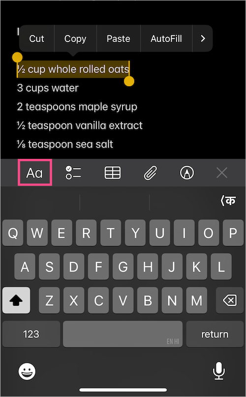 - 選擇文本後,點擊+按鈕出現在鍵盤上方。