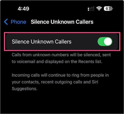 - 找到讓未知來電者保持沉默選項並將其打開。