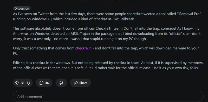 然而,一個廣泛分享的帖子指出,該工具的 checkra1n 版本與 Checkra1n 團隊的任何官方版本都不相符,敦促他們只信任 checkra.in 等官方來源。