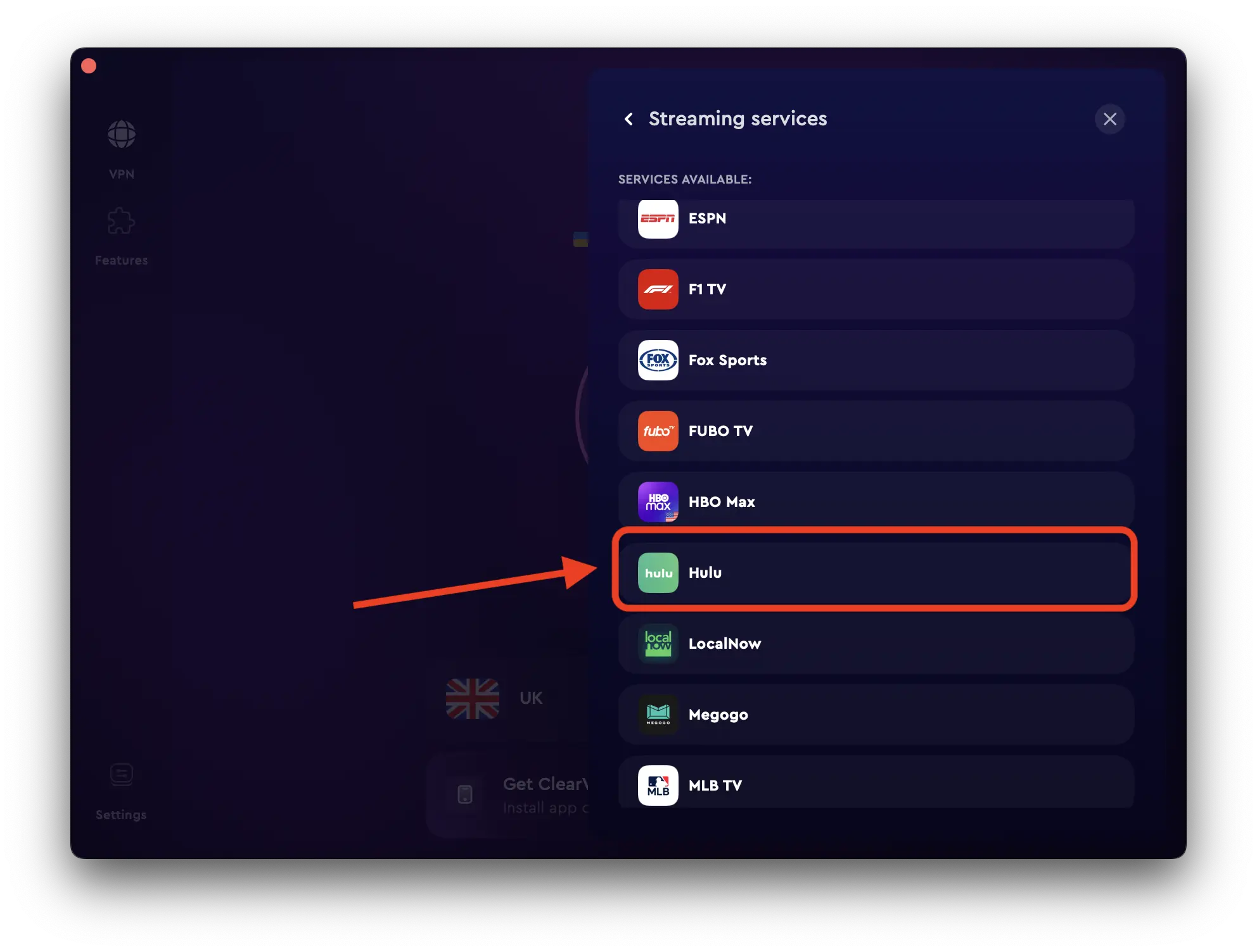 - 然後,選擇您希望取消阻止的流服務。在這種情況下,Hulu。