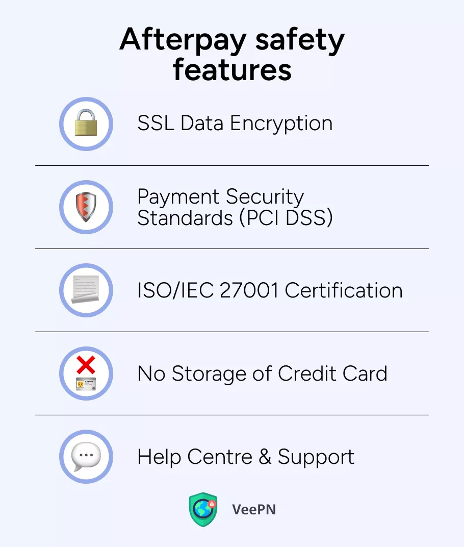 Afterpay 擁有先進的風險評估算法和符合 PCI DSS 的數據加密,以保護交易並降低在線欺詐風險。話雖如此,讓我們來看看 Afterpay 安全措施的主要特點: